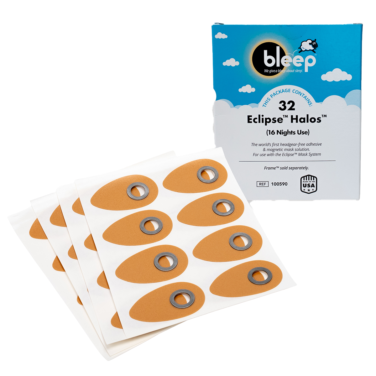Halos are an integral part of the Eclipse CPAP system from Bleep. They’re an adhesive that’s designed to attach directly to the Eclipse frame, eliminating the need for a traditional CPAP mask. Each Halo has a hole that fits around your nostril, as well as a magnetized ring that connects to the Eclipse frame’s matching magnet.
