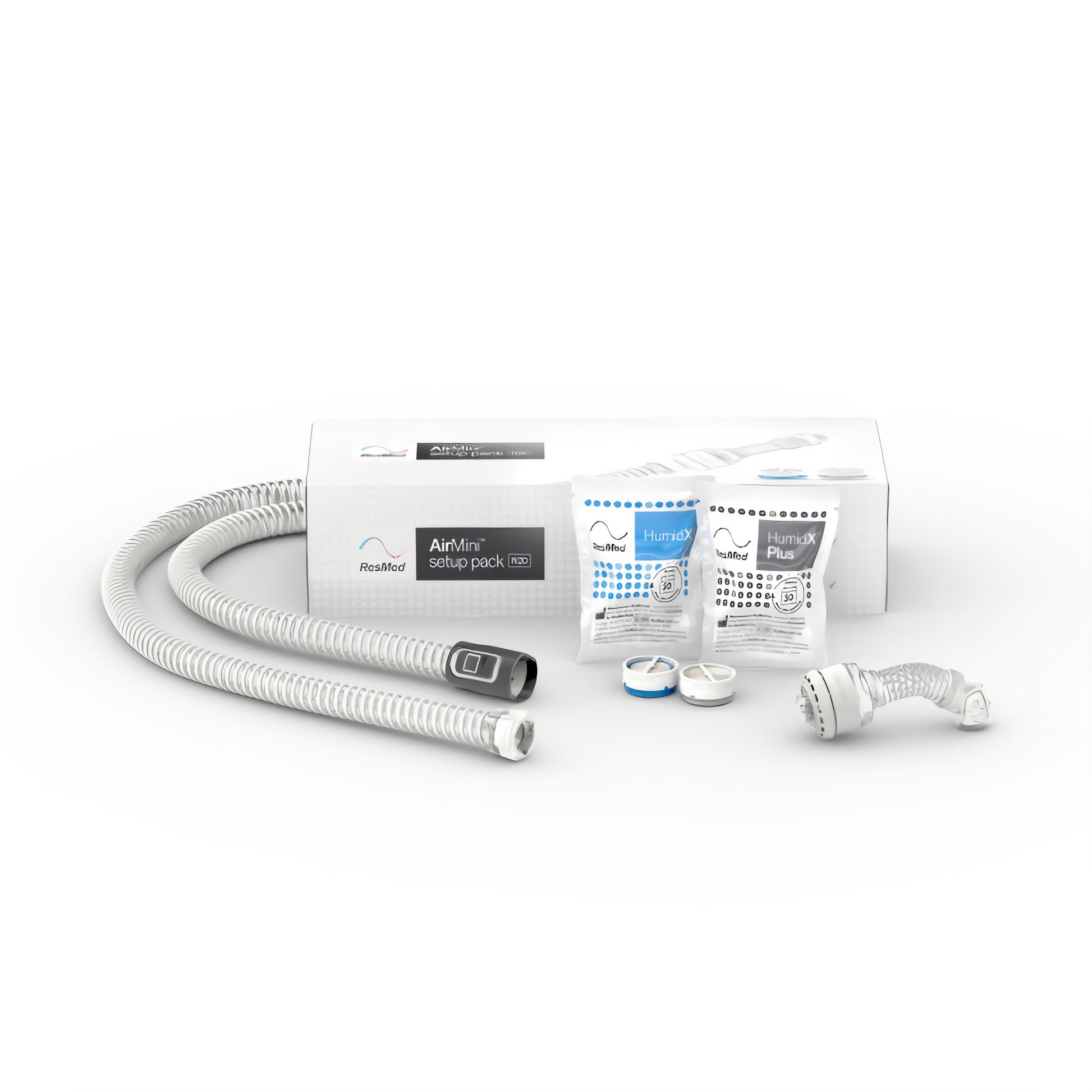 The ResMed AirMini™ N20 setup pack connects your AirMini to either a ResMed AirFit™ N20 or ResMed AirTouch™ N20 nasal CPAP mask. It includes an AirMini N20 mask connector, tubing and waterless humidification – ResMed HumidX™ for average conditions and HumidX Plus for dry conditions, including aircraft cabins. This purchase does not include an N20 series mask or an AirMini machine.